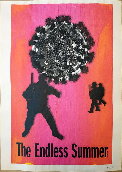 Silkscreened poster. 3 inks. Image area 15 x 22.5. Paper size: 18 x 24.75. Printed on newsprint paper. One-of-a-kind.